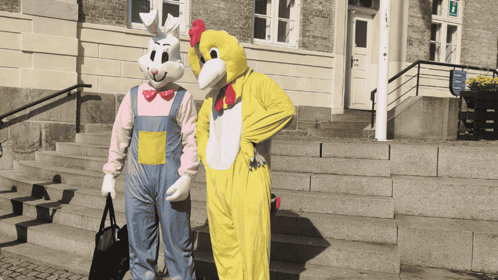 Du kan møde påskeharen- og kyllingen, der uddeler påskelækkerier på gågaden i Aabenraa.